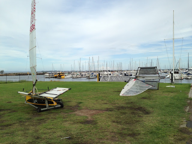 The deserted rigging lawn at DPSS, a glamour winter's day in Queensland. The boat has been on the water half a dozen times now, and looking fairly promising, though lining up against other moths has proved tricky.